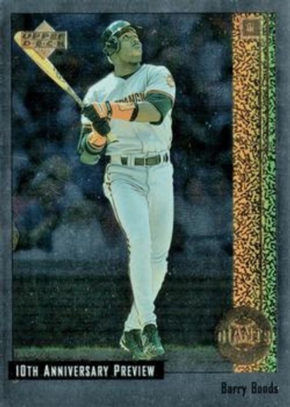 The Barry Bonds 1998 Upper Deck #56 10th Anniversary Preview card is 1 of 21 Barry Bonds' card variations in the 1998 Upper Deck set being tracked by Sports Card Investor, including #625 Base, #144 Base, #505 Base, #56 10th Anniversary Preview Edition Retail, and #AS18 All Star Credentials.