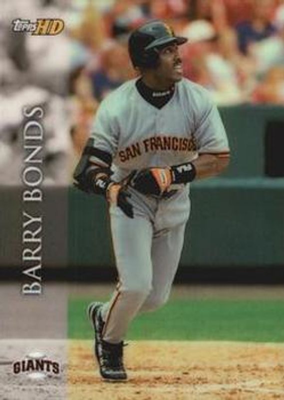 The Barry Bonds 2000 Topps High Definition (HD) #65 Base card is 1 of 5 Barry Bonds' card variations in the 2000 Topps High Definition (HD) set being tracked by Sports Card Investor, including Platinum, Ballpark Figures, Image, and On the Cutting Edge.