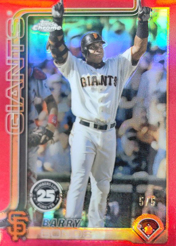 The Barry Bonds 2025 Topps Chrome #NLF-1 Numbers Live Forever - Red Refractor /5 card in Raw condition has not changed in price in the last 30 days and was last sold for $1,009.00 .