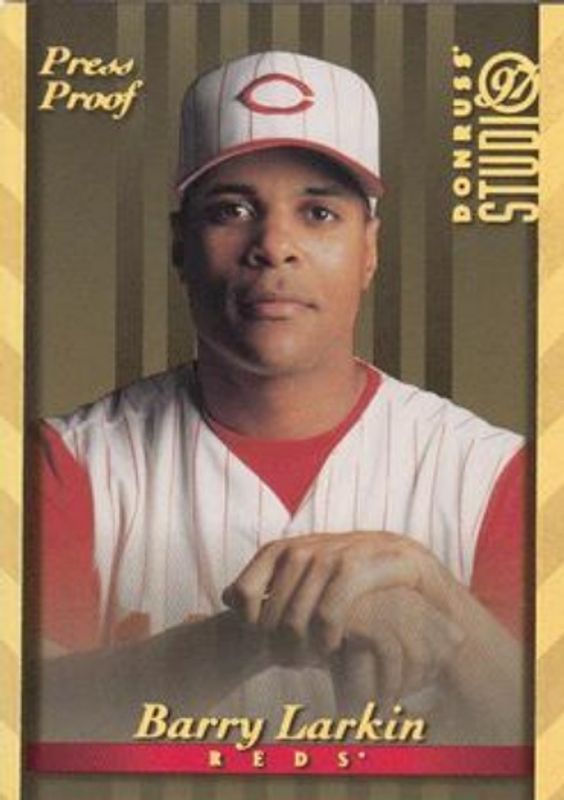 The Barry Larkin 1997 Donruss Studio #9 Press Proof Gold card is 1 of 4 Barry Larkin's card variations in the 1997 Donruss Studio set being tracked by Sports Card Investor, including Base, Press Proof Silver, and Hard Hats /5000.
