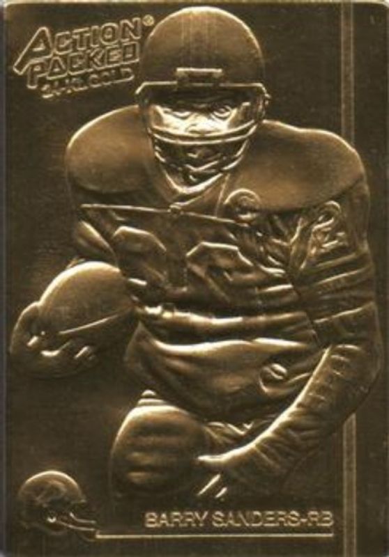 The Barry Sanders 1992 Action Packed #43G Mint Prototype /1000 card is 1 of 9 Barry Sanders' card variations in the 1992 Action Packed set being tracked by Sports Card Investor, including Base, Prototypes, Mint /500, 18 Kt. Gold Barry Sanders Exchange, and 24 Kt. Gold.