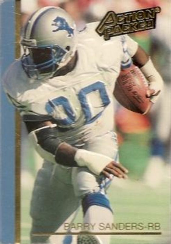 The Barry Sanders 1992 Action Packed #92P Prototypes card is 1 of 9 Barry Sanders' card variations in the 1992 Action Packed set being tracked by Sports Card Investor, including Base, Mint Prototype /1000, Mint /500, 18 Kt. Gold Barry Sanders Exchange, and 24 Kt. Gold.