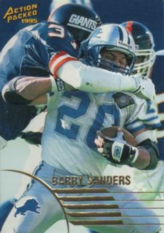 The Barry Sanders 1995 Action Packed Rookies & Stars #12 Prototypes card is 1 of 6 Barry Sanders' card variations in the 1995 Action Packed Rookies & Stars set being tracked by Sports Card Investor, including Base, Stargazers, 24K Gold, Bustout, and Closing Seconds.