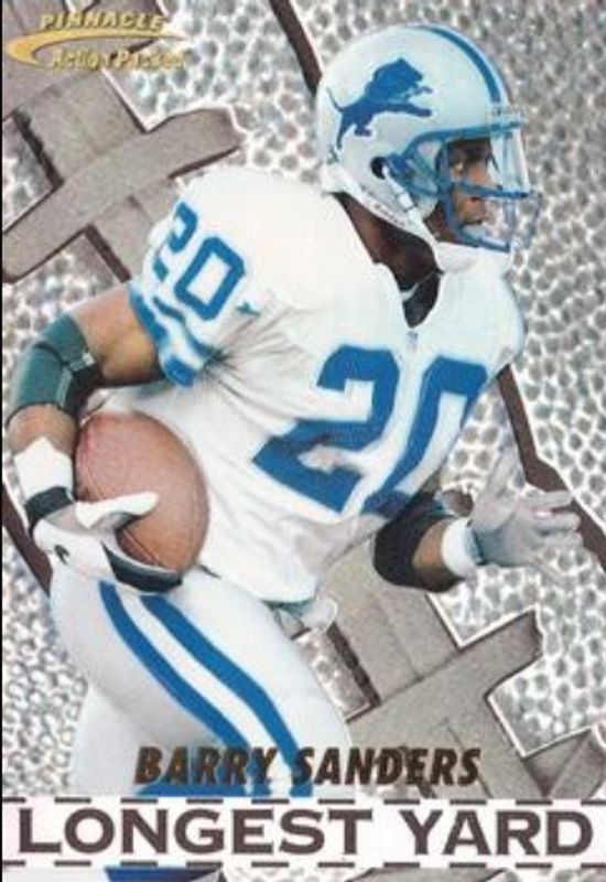 The Barry Sanders 1996 Action Packed Flagship #7 Longest Yard card is 1 of 7 Barry Sanders' card variations in the 1996 Action Packed Flagship set being tracked by Sports Card Investor, including Base, Artist's Proofs, 24kt Gold, Ball Hog, and Sculptor's Proof.