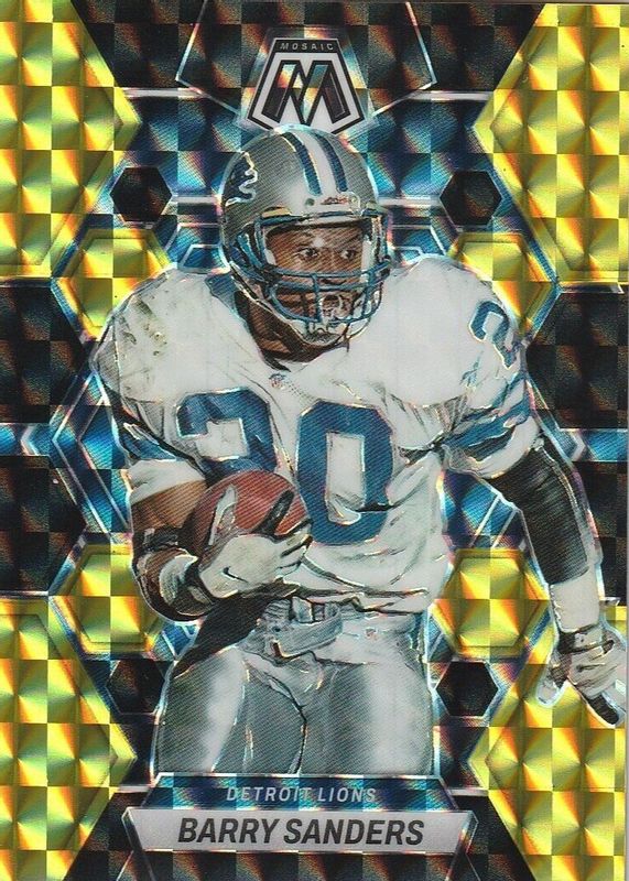 This card is 1 of 25 Barry Sanders' card variations in the 2023 Mosaic set being tracked by Sports Card Investor, including Choice Peacock /(SSP), Genesis /(SSP), Honeycomb /(SSP), No Huddle Purple /50, and Red Sparkle /(SSP).