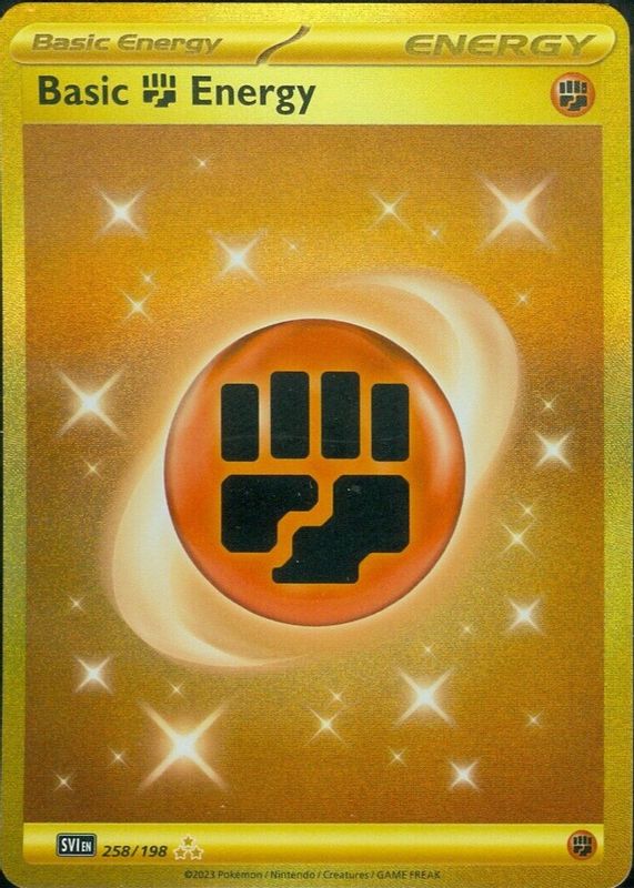 The Basic Fighting Energy 2023 Scarlet & Violet #258/198 Hyper Rare (Secret) card in Raw TCG (Near Mint) condition has moved up $5.63 (+82.1%) in the last 30 days and was last sold for $12.49 .