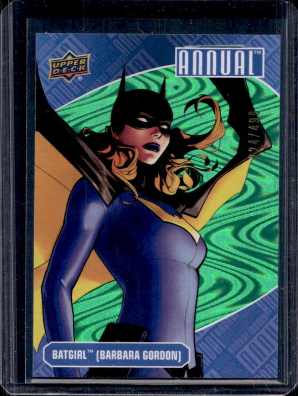 The Batgirl 2023 Upper Deck DC Annual #39 Green /499 card is 1 of 35 Batgirl's card variations in the 2023 Upper Deck DC Annual set being tracked by Sports Card Investor, including #39 Base, #43 Base, #43 Blue, #39 Blue, and #43 Silver Sparkle.