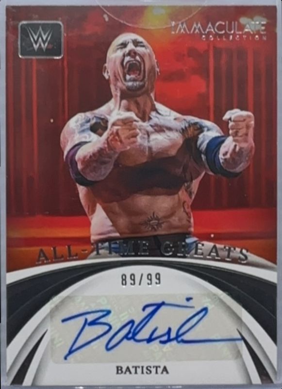 The Batista 2022 Immaculate WWE #AG-BTS All Time Greats Signatures /99 card is 1 of 9 Batista's card variations in the 2022 Immaculate WWE set being tracked by Sports Card Investor, including Base /99, Red /25, Gold /10, Green /5, and Platinum /1.