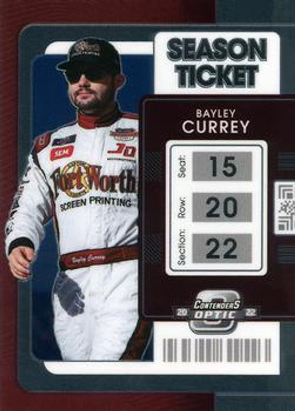 The Bayley Currey 2022 Chronicles NASCAR #5 Contenders Optic card is 1 of 18 Bayley Currey's card variations in the 2022 Chronicles NASCAR set being tracked by Sports Card Investor, including Absolute, Absolute Autographs, Contenders Optic Autographs, Contenders Optic Green, and Contenders Optic Holo.