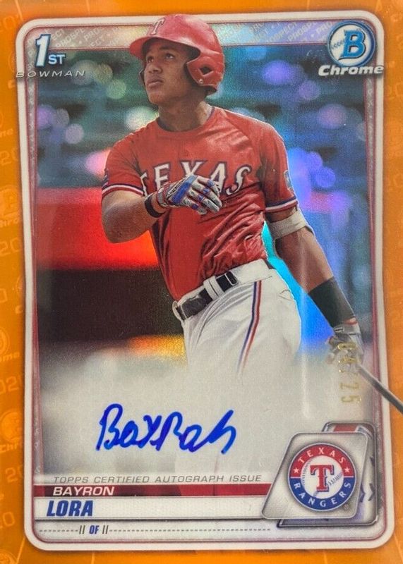 The Bayron Lora 2020 Bowman Chrome #CPA-BL Prospect Auto - Orange Refractor /25 (1st) card in Raw condition has not changed in price in the last 30 days and was last sold for $14.00 .