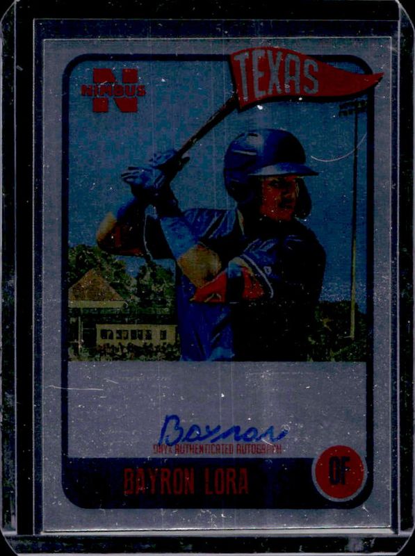 The Bayron Lora 2020 Onyx Nimbus #NABL Autographs Silver /375 card is 1 of 7 Bayron Lora's card variations in the 2020 Onyx Nimbus set being tracked by Sports Card Investor, including Base, Autographs Black, Autographs Gold, Black, and Gold.