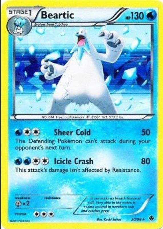 The Beartic 2011 Black & White: Emerging Powers #30/98 Promo (Cracked Ice) card in Raw TCG (Near Mint) condition has not changed in price in the last 30 days and was last sold for $5.49 .