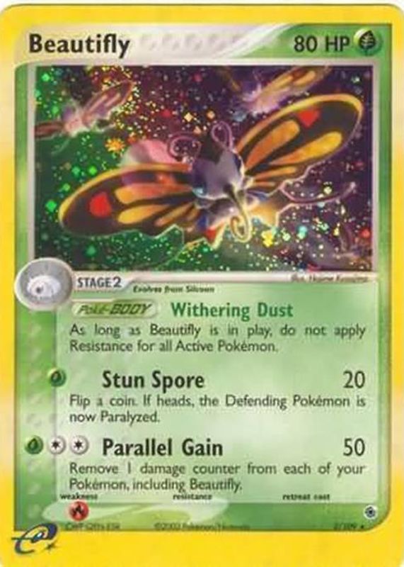 The Beautifly 2003 EX: Ruby & Sapphire #002/109 Holo card in Raw TCG (Near Mint) condition has moved down -$11.99 (-48.0%) in the last 30 days and was last sold for $13.00 .