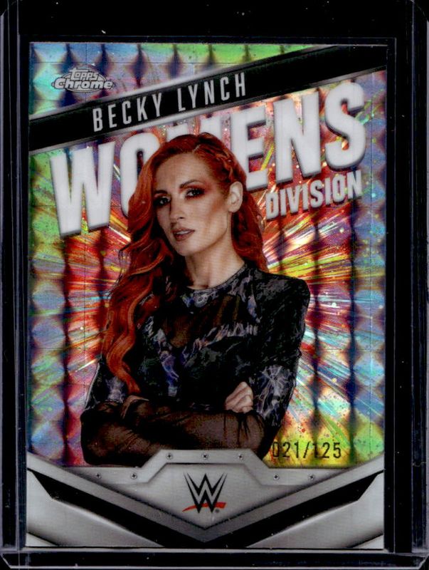 The Becky Lynch 2025 Topps Chrome WWE #WD-BEC Women's Division - Aqua Geometric Refractor /125 card is 1 of 86 Becky Lynch's card variations in the 2025 Topps Chrome WWE set being tracked by Sports Card Investor, including #133 Base, #133 Black & Gold Refractor, #133 Geometric Refractor, #278 Image Variation, and #236 Image Variation.