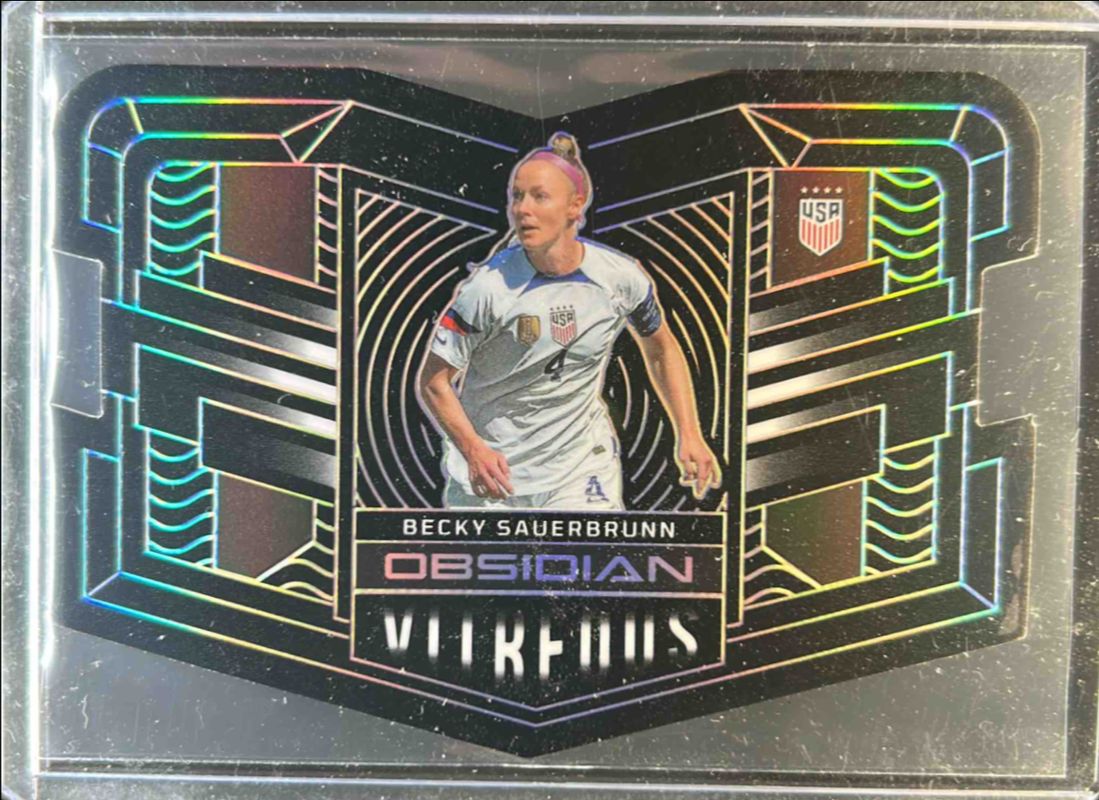 The Becky Sauerbrunn 2022 Obsidian #2 Vitreous /115 card is 1 of 11 Becky Sauerbrunn's card variations in the 2022 Obsidian set being tracked by Sports Card Investor, including Vitreous - Electric Etch Orange /65, Vitreous - Electric Etch Purple /30, Vitreous - Electric Etch Red Pulsar /30, Vitreous - Electric Etch Blue /20, and Vitreous - Electric Etch White Pulsar /11.