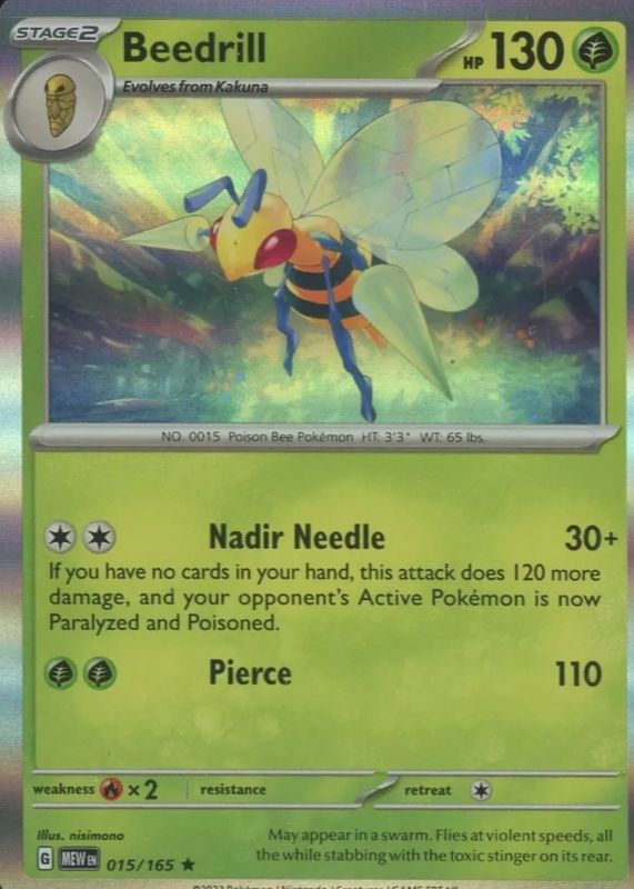 This card is 1 of 3 Beedrill's card variations in the 2023 Scarlet & Violet: 151 set being tracked by Sports Card Investor, including Base, and Reverse Holo.