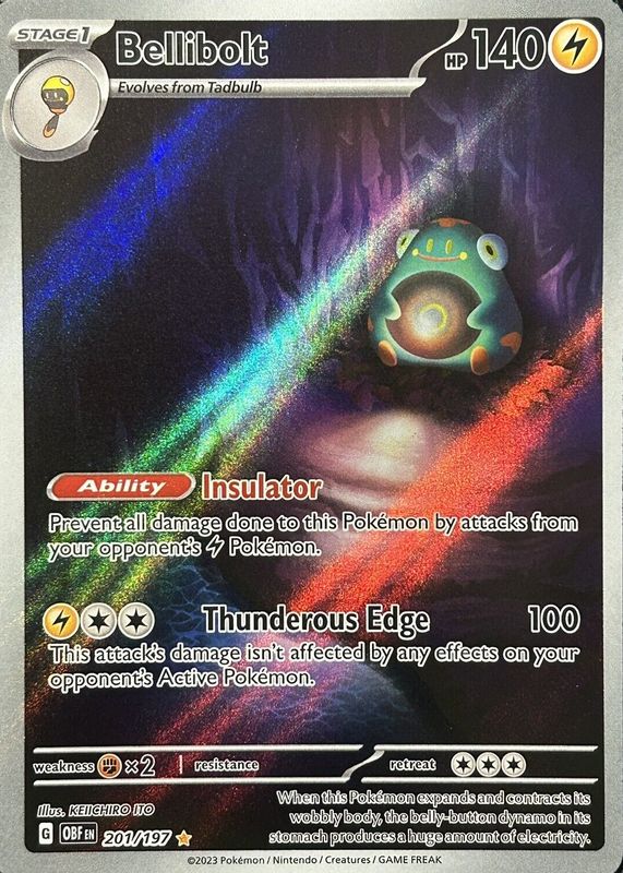 The Bellibolt 2023 Scarlet & Violet: Obsidian Flames #201/197 Illustration Rare card in Raw TCG (Near Mint) condition has moved up $4.08 (+97.1%) in the last 30 days and was last sold for $8.28 .