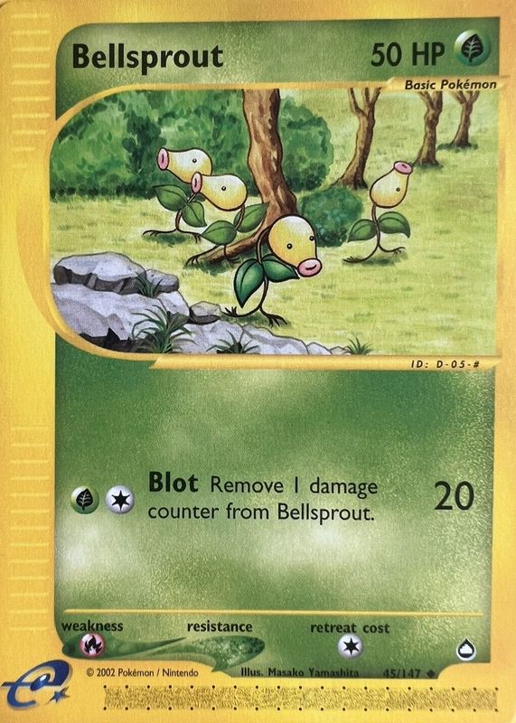 The Bellsprout 2003 Aquapolis #045/147 Base card in Raw TCG (Near Mint) condition has moved down -$4.87 (-48.7%) in the last 30 days and was last sold for $5.12 .