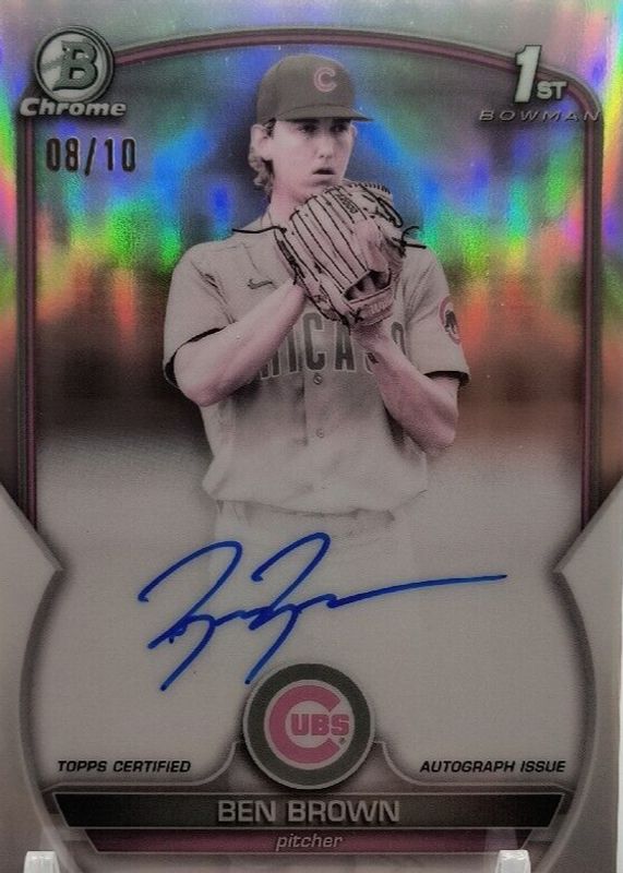 The Ben Brown 2023 Bowman #CPA-BBN Chrome Prospect Auto - Pearl Refractor /10 (1st) card in Raw condition has not changed in price in the last 30 days and was last sold for $168.50 .