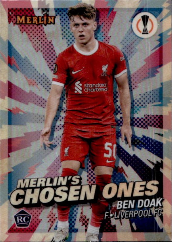 The Ben Doak 2023 Topps Merlin Chrome UEFA Club Competitions #MC-8 Merlin's Chosen One Rookie card is 1 of 43 Ben Doak's card variations in the 2023 Topps Merlin Chrome UEFA Club Competitions set being tracked by Sports Card Investor, including Base, Aqua Prism Refractor, Refractor, Vintage Merlin Refractor, and Neon Green Shimmer Refractor /399.