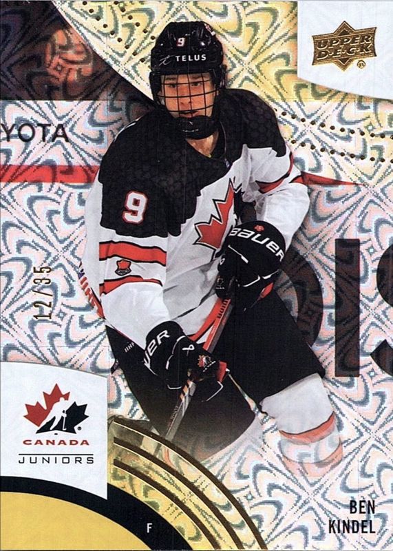 The Ben Kindel 2025 Upper Deck Team Canada Juniors #66 Gold Patterned Foilboard /35 Rookie card is 1 of 42 Ben Kindel's card variations in the 2025 Upper Deck Team Canada Juniors set being tracked by Sports Card Investor, including Base, Blue Patterned Foilboard, Clear Cut, Jersey, and Outburst.
