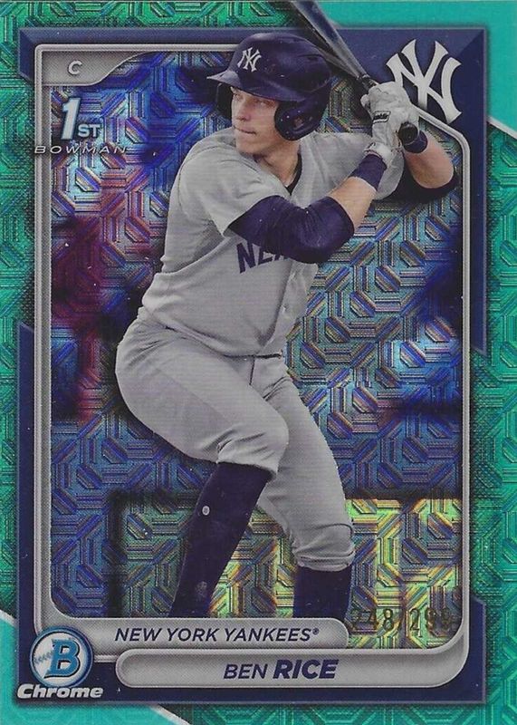 The Ben Rice 2024 Bowman Chrome Mega Box #BCP-186 Prospects - Aqua Mojo Refractor /299 (1st) card in Raw condition has not changed in price in the last 30 days and was last sold for $75.00 .