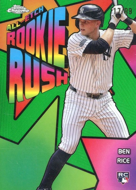 The Ben Rice 2025 Topps Chrome #CERR-16 All-Etch Rookie Rush - Green Refractor /99 card in Raw condition has not changed in price in the last 30 days and was last sold for $18.00 .