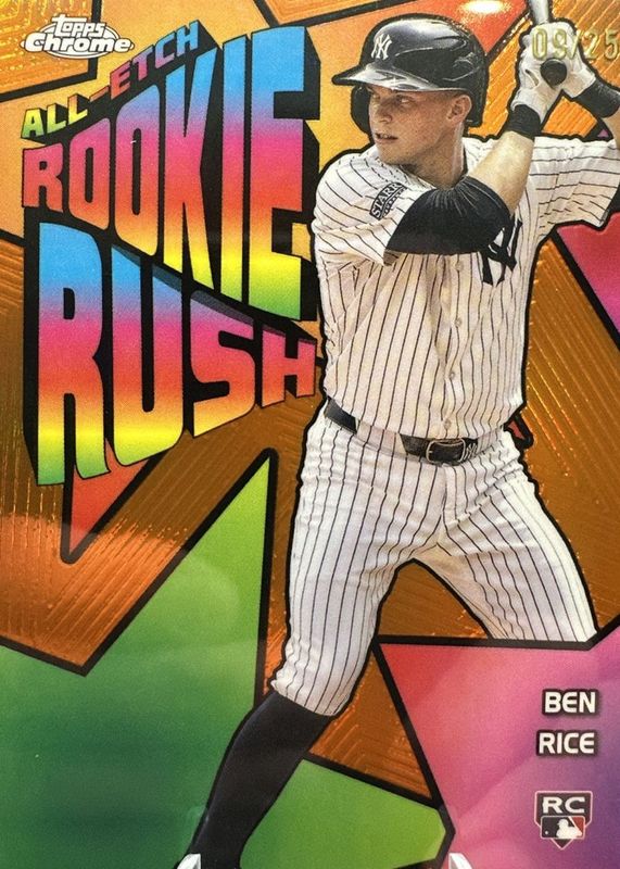 The Ben Rice 2025 Topps Chrome #CERR-16 All-Etch Rookie Rush - Orange Refractor /25 card in Raw condition has not changed in price in the last 30 days and was last sold for $63.00 .