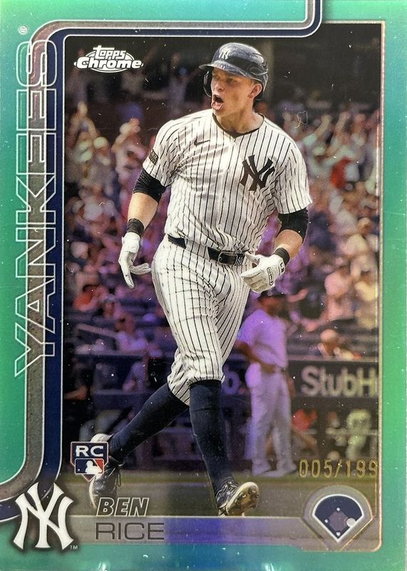 The Ben Rice 2025 Topps Chrome #139 Aqua Refractor /199 Rookie card in Raw condition has not changed in price in the last 30 days and was last sold for $14.00 .