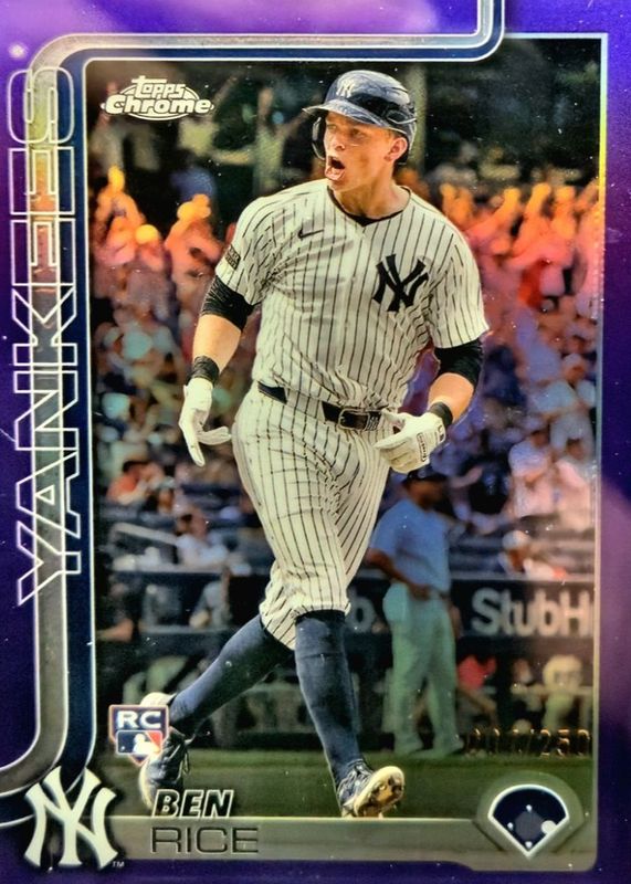 The Ben Rice 2025 Topps Chrome #139 Purple Refractor /250 Rookie card in Raw condition has moved up $21.95 (+122%) in the last 30 days and was last sold for $39.95 .