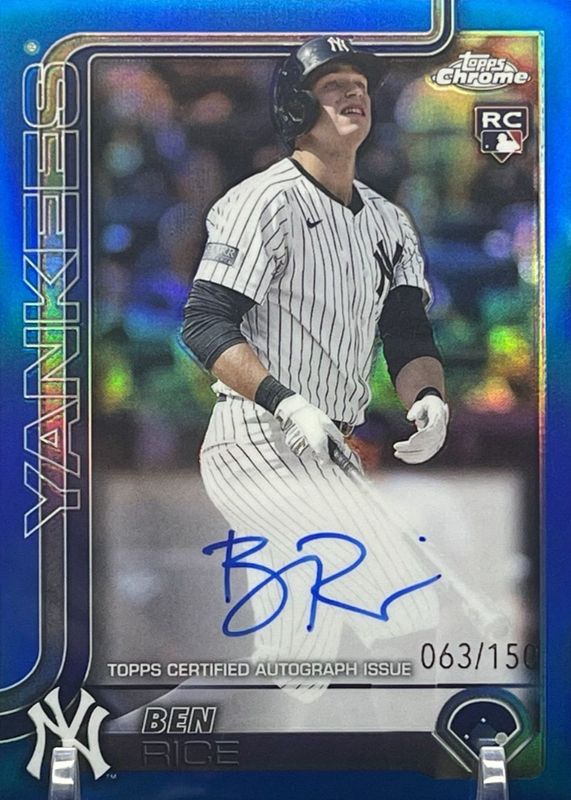 The Ben Rice 2025 Topps Chrome #RA-BR Rookie Autographs - Blue Refractor /150 card in Raw condition has moved up $27.75 (+20.2%) in the last 30 days and was last sold for $165.25 .