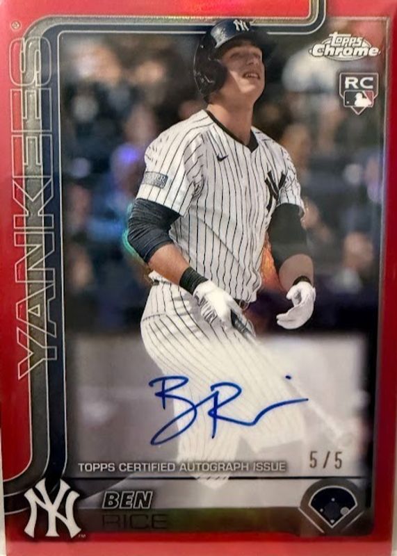 The Ben Rice 2025 Topps Chrome #RA-BR Rookie Autographs - Red Refractor /5 card in Raw condition has not changed in price in the last 30 days and was last sold for $1,200.00 .