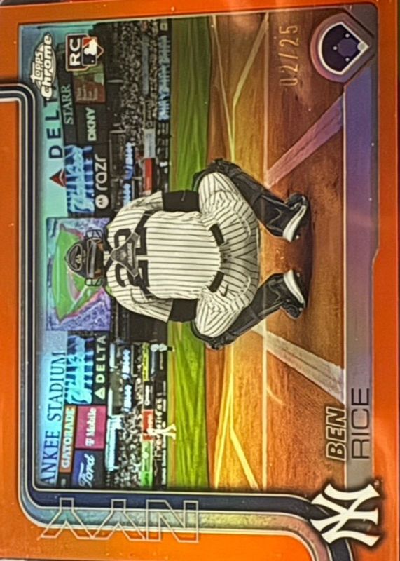 The Ben Rice 2025 Topps Chrome Update #USC138 Image Variation - Orange Refractor /25 Rookie card in Raw condition has not changed in price in the last 30 days and was last sold for $300.00 .