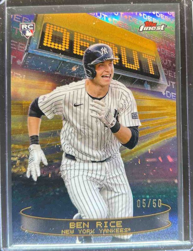 The Ben Rice 2025 Topps Finest #D-8 Debut - Gold Refractor /50 Rookie card is 1 of 70 Ben Rice's card variations in the 2025 Topps Finest set being tracked by Sports Card Investor, including Common, Common - Checkerboard Refractor, Common - Refractor, Common - Magenta Refractor /350, and Common - Sky Blue Refractor /325.