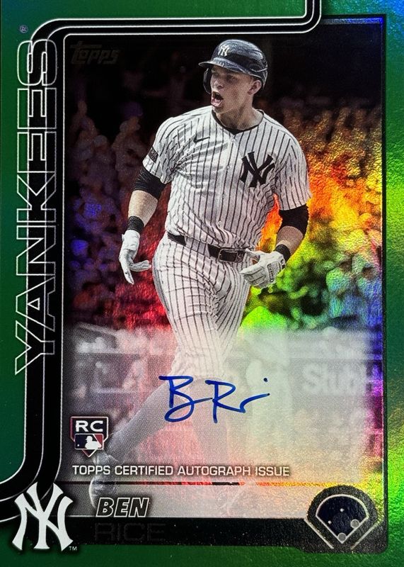 The Ben Rice 2025 Topps #337 Flagship Real One Autographs - Green Foil /99 Rookie card in Raw condition has not changed in price in the last 30 days and was last sold for $96.35 .