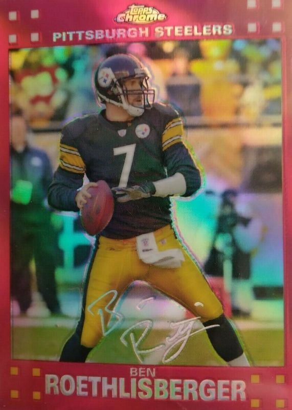 This card is 1 of 5 Ben Roethlisberger's card variations in the 2007 Topps Chrome set being tracked by Sports Card Investor, including Blue Refractor, Refractor, X-Fractor, and White Refractor /869.