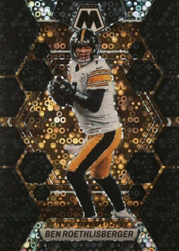This card is 1 of 8 Ben Roethlisberger's card variations in the 2023 Mosaic set being tracked by Sports Card Investor, including Choice Peacock /(SSP), Genesis /(SSP), Honeycomb /(SSP), White Sparkle /(SSP), and No Huddle Gold /10.