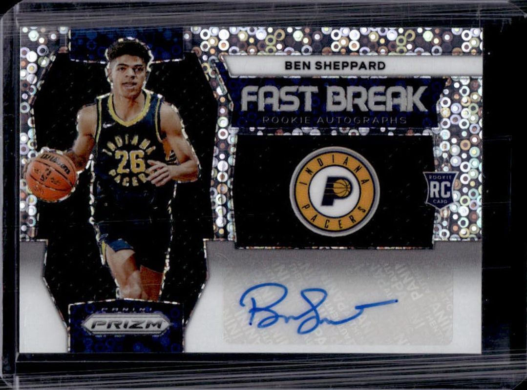 The Ben Sheppard 2023 Prizm #FBR-BEN Fast Break Rookie Autographs card is 1 of 95 Ben Sheppard's card variations in the 2023 Prizm set being tracked by Sports Card Investor, including Base, Blue Wave, Choice Blue Yellow Green, Fast Break, and Green.