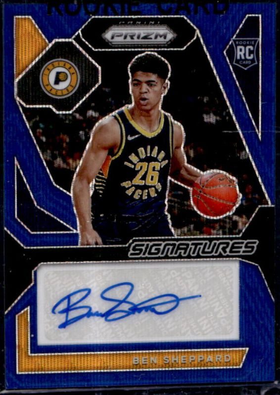 The Ben Sheppard 2023 Prizm #RSI-BEN Rookie Signatures - Blue Wave card is 1 of 95 Ben Sheppard's card variations in the 2023 Prizm set being tracked by Sports Card Investor, including Base, Blue Wave, Choice Blue Yellow Green, Fast Break, and Green.