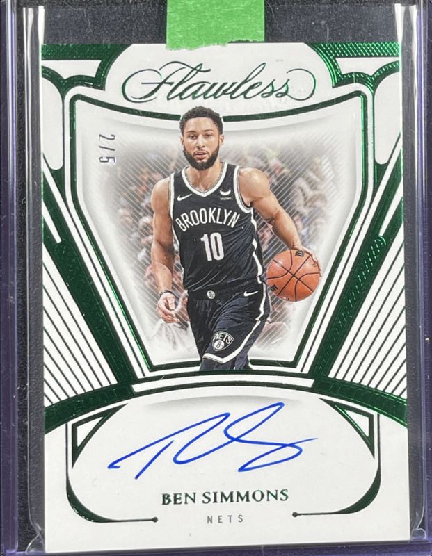 The Ben Simmons 2023 Flawless #FA-BEN Flawless Autographs - Emerald /5 card is 1 of 20 Ben Simmons' card variations in the 2023 Flawless set being tracked by Sports Card Investor, including Draft Gem Signatures /25, Flawless Autographs /25, Flawless Patch Autographs /25, Draft Gem Signatures - Ruby /15, and Flawless Autographs - Ruby /15.