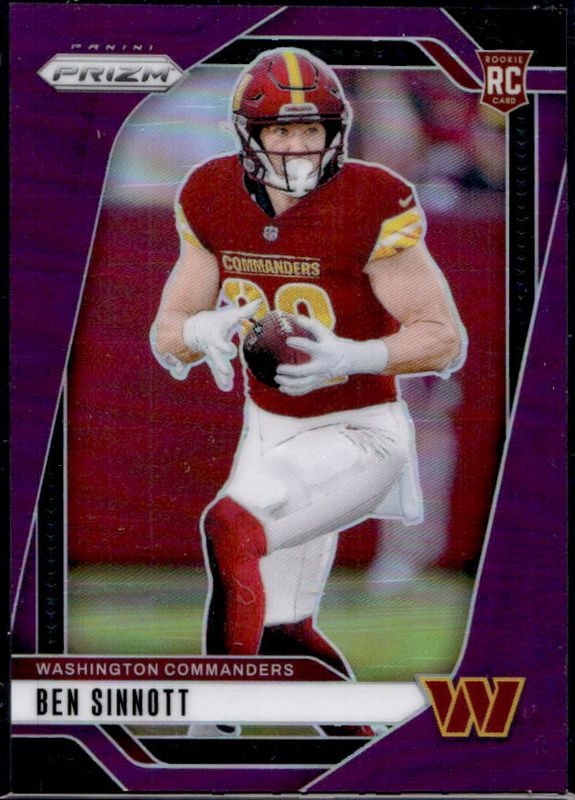 The Ben Sinnott 2024 Prizm #307 Purple /125 Rookie card is 1 of 87 Ben Sinnott's card variations in the 2024 Prizm set being tracked by Sports Card Investor, including Base, Choice Blue Yellow Green, Choice Silver, Disco, and Green.