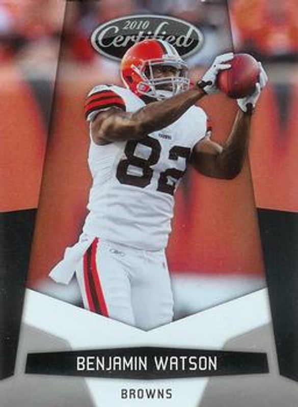 The Ben Watson 2010 Certified #33 Base /299 card is 1 of 11 Ben Watson's card variations in the 2010 Certified set being tracked by Sports Card Investor, including Platinum Red /999, Mirror Red /250, Mirror Blue /100, Platinum Blue /100, and Mirror Gold /25.