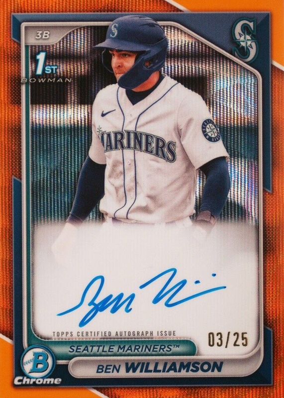 The Ben Williamson 2024 Bowman #CPA-BWI Chrome Prospect Auto - Orange Wave Refractor /25 (1st) card in Raw condition has not changed in price in the last 30 days and was last sold for $150.00 .