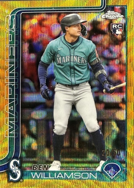 The Ben Williamson 2025 Topps Chrome Update #USC168 Gold Wave Refractor /50 Rookie card in Raw condition has moved down -$3.50 (-29.2%) in the last 30 days and was last sold for $8.50 .