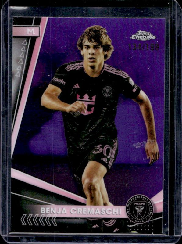 The Benja Cremaschi 2024 Topps Chrome MLS #39 Purple Refractor /199 card is 1 of 37 Benja Cremaschi's card variations in the 2024 Topps Chrome MLS set being tracked by Sports Card Investor, including Base, Aqua Lava Refractor, Gold Lava Refractor, Neon Green Lava Refractor, and Prism Refractor.
