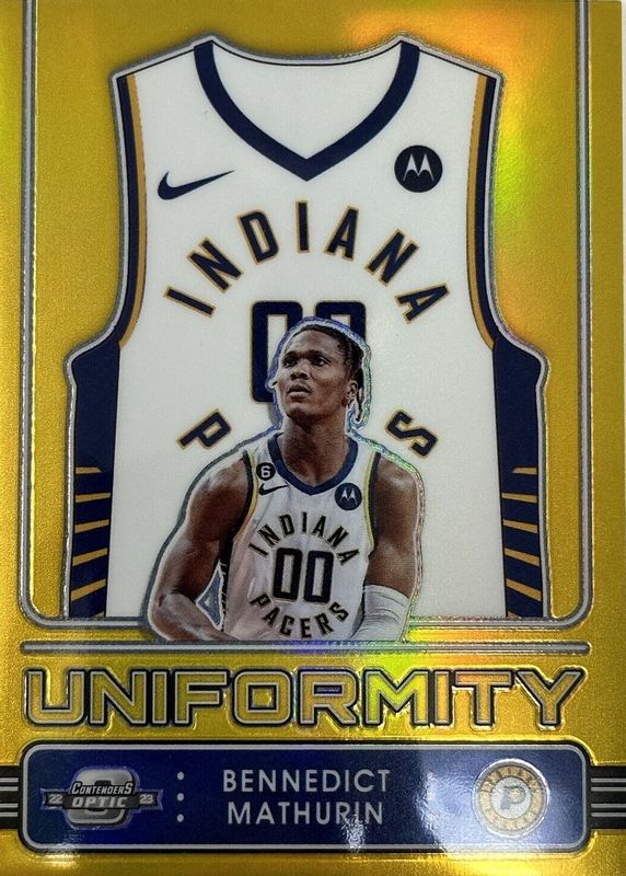 The Bennedict Mathurin 2022 Contenders Optic #28 Uniformity - Gold /10 Rookie card in Raw condition has not changed in price in the last 30 days and was last sold for $75.00 .