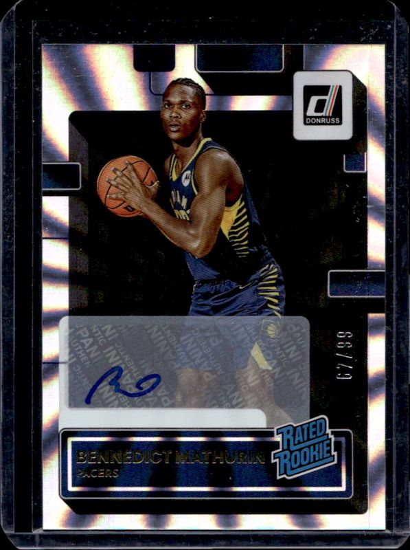 The Bennedict Mathurin 2022 Donruss #206 Rated Rookie Signatures - Holo Laser /99 card is 1 of 50 Bennedict Mathurin's card variations in the 2022 Donruss set being tracked by Sports Card Investor, including Base, Choice, Holo Green Laser, Holo Red & Gold Laser, and Press Proof Silver.