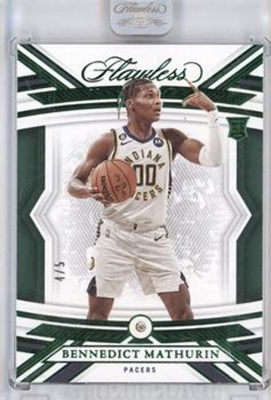 The Bennedict Mathurin 2022 Flawless #18 Emerald /5 Rookie card is 1 of 69 Bennedict Mathurin's card variations in the 2022 Flawless set being tracked by Sports Card Investor, including #18 Base /5, #18 Gold /10, #142 Bronze /3, #18 Bronze /3, and #SSS-BNM Star Swatch Signatures (/25).