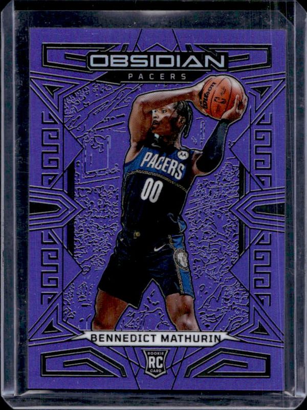 The Bennedict Mathurin 2022 Obsidian #181 Electric Etch Purple Flood /49 Rookie card is 1 of 96 Bennedict Mathurin's card variations in the 2022 Obsidian set being tracked by Sports Card Investor, including Electric Etch Asia, Electric Etch Neon Flood, Electric Etch Red Flood, Electric Etch White Pulsar, and Electric Etch Purple /75.