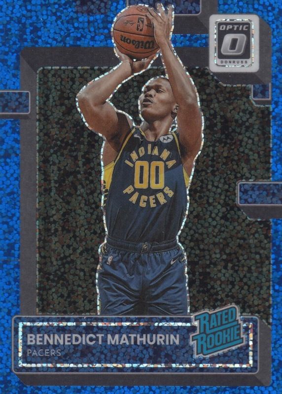 The Bennedict Mathurin 2022 Optic #209 Blue Sparkle /180 Rookie card in Raw condition has not changed in price in the last 30 days and was last sold for $20.50 .